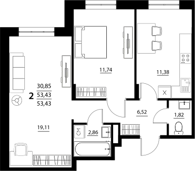 2-комнатная 53.43 м2 2-комнатная 53.43 м2 1 дом, 5 этаж, № 189 Южные резиденции 4 квартал 2026 5 237 000 ₽ 98 000 за м2