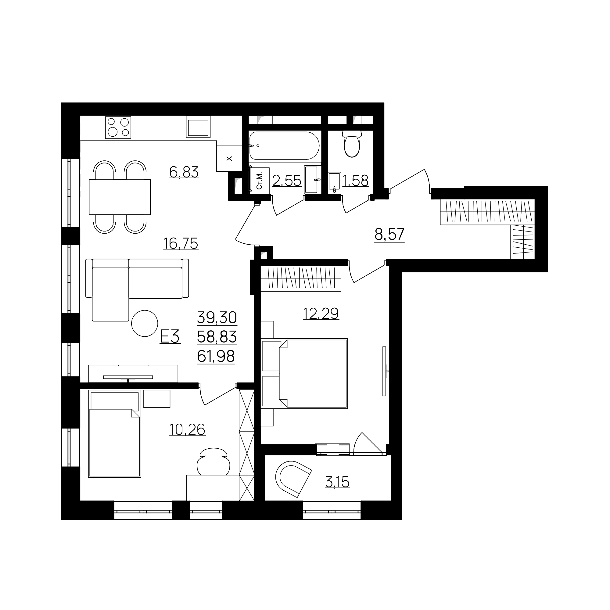 3-комнатная 61,98 м2